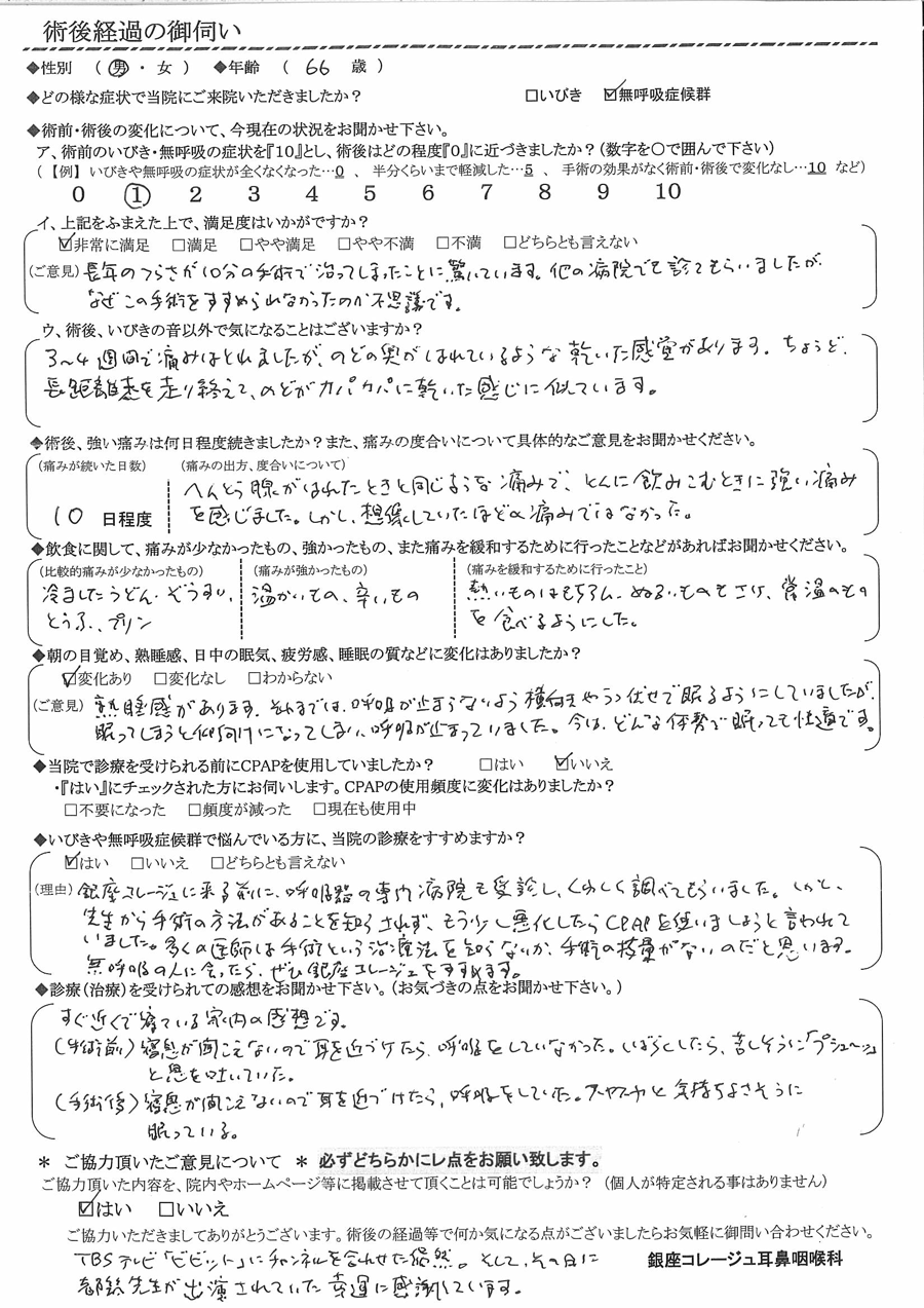 (理由) 銀座コレージュに来る前に、呼吸器の専門病院も受診し、詳しく調べてもらいました。しかし先生から手術の方法があることを知らされず、もう少し悪化したらCPAPを使いましょうと言われていました。多くの医師は手術という治療法を知らないか、手術の技量がないのだと思います。無呼吸の人に会ったら、ぜひ銀座コレージュをすすめます。