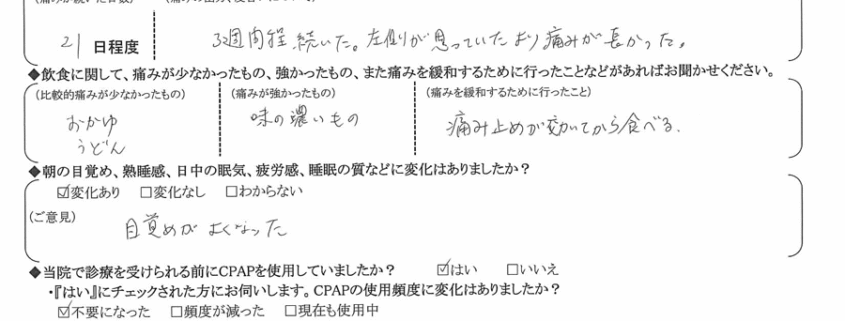 (痛みの程度について) 3週間ほど続いた。左側が思っていたより痛みが長かった。