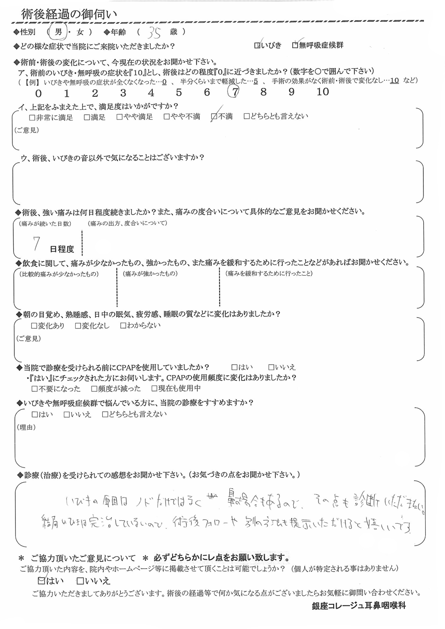 ア, 術前のいびき・無呼吸の症状を『10』だったとすると、術後はどの程度になりましたか? 【7】