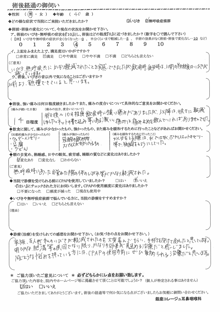 A: 家族、友人に私のいびきが軽減されたのを大変喜んでもらい、手術を受けて良かったと思っています。明らかな肥満等の原因でない限り、かなりの効果が見込める治療だと感じました。同じような悩みを持っている方には、CPAPの使用の前にぜひ勧められる治療だと思います。