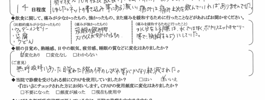 (ご意見) 無呼吸時にあった目覚めた際の体のシビレ等がかなり軽減された
