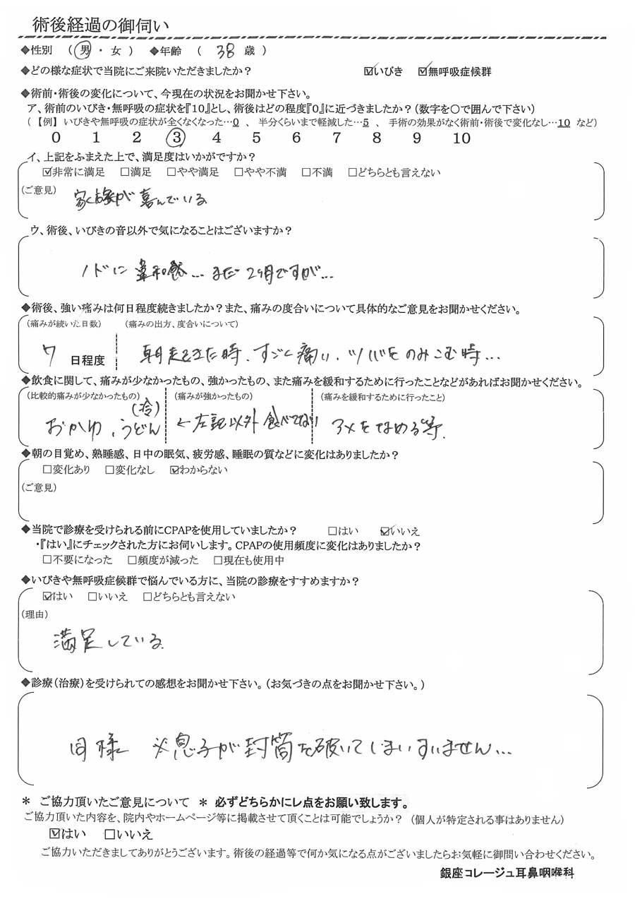 ア, 術前のいびき・無呼吸の症状を『10』だったとすると、術後はどの程度になりましたか? 【3】