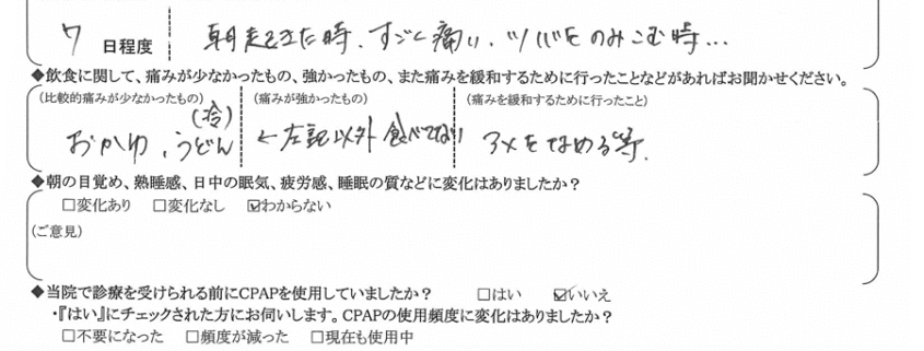 (痛みの程度について) 朝起きた時、すごく痛い。ツバを飲み込む時…