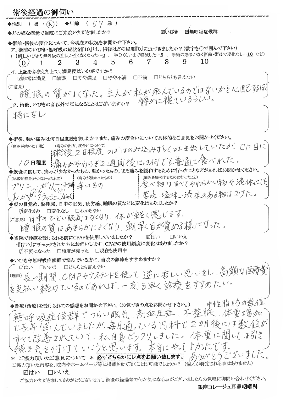A: 無呼吸症候群で辛い眠気、高血圧症、不整脈、中性脂肪の数値、体重増加で長年悩んでいましたが、毎月通っている内科で2か月後には数値が全て改善されていて、私自身ビックリしました。体重に関しては引き続き気をつけていこうと思います。本当にやってよかったです。ありがとうございました。