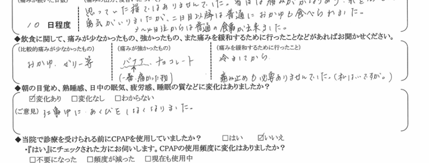(痛みの程度について) 思っていた程ではありませんでした。当日は痛みがかなりあり、水を飲むのも勇気がいりましたが、二日目以降は普通におかゆも食べられました。3~4日位からは普通の食事が出来ました。