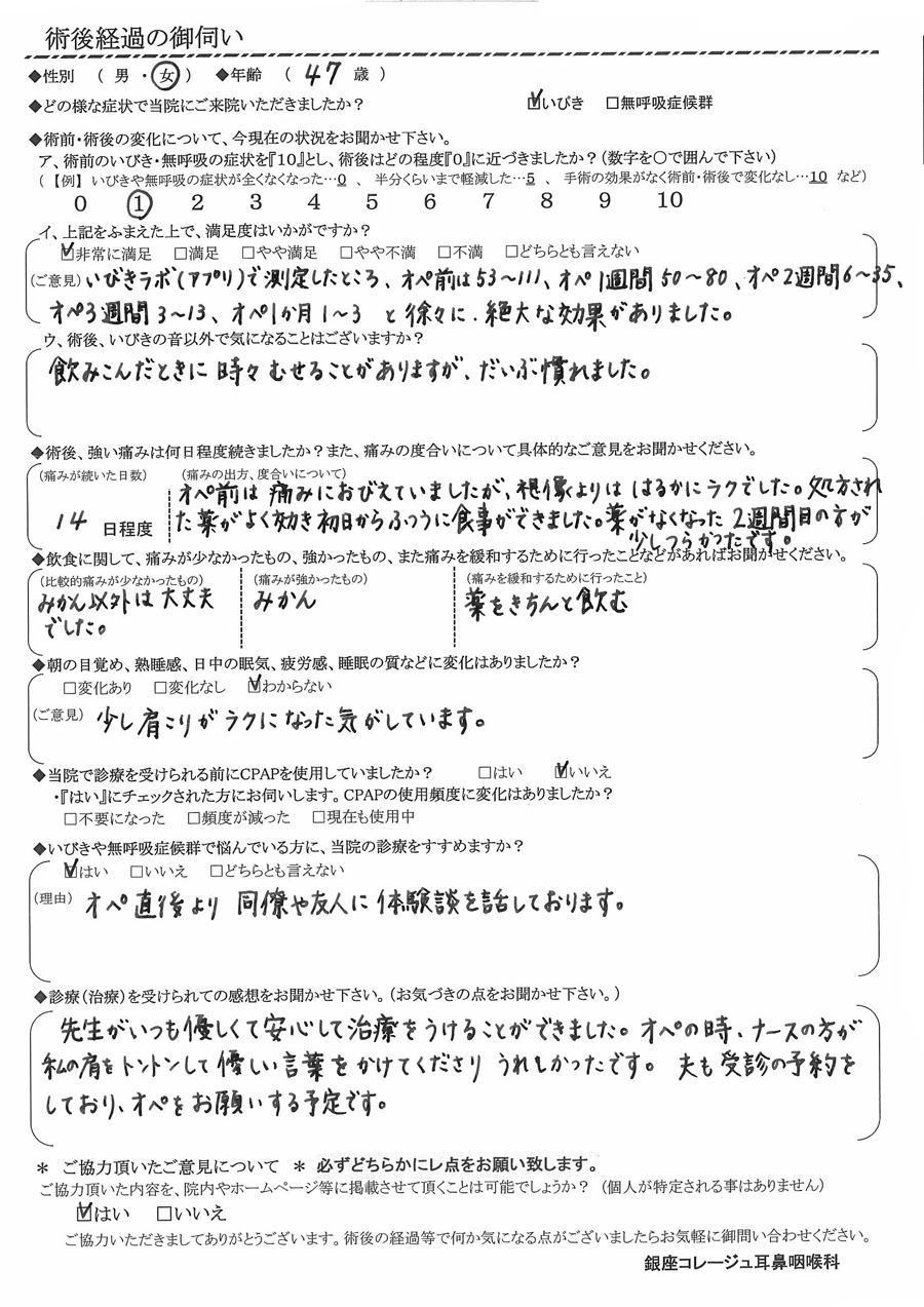 (ご意見) いびきラボ(アプリ)で測定した所、オペ前は53~111、オペ1週間50~80、オペ2週間6~35、オペ3週間3~13、オペ1ヶ月1~3と徐々に、絶大な効果がありました。
