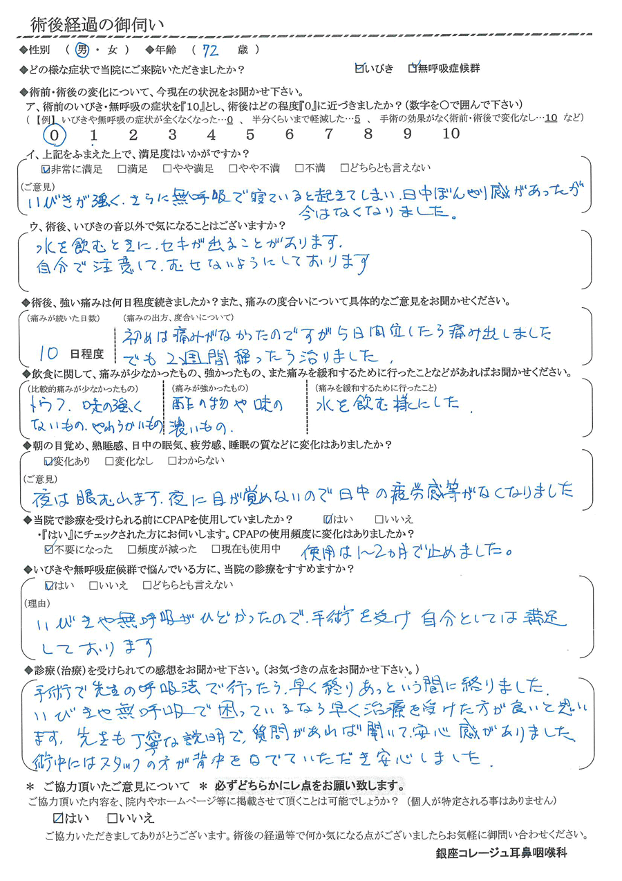 (理由) いびきや無呼吸がひどかったので、手術を受け自分としては満足しております。