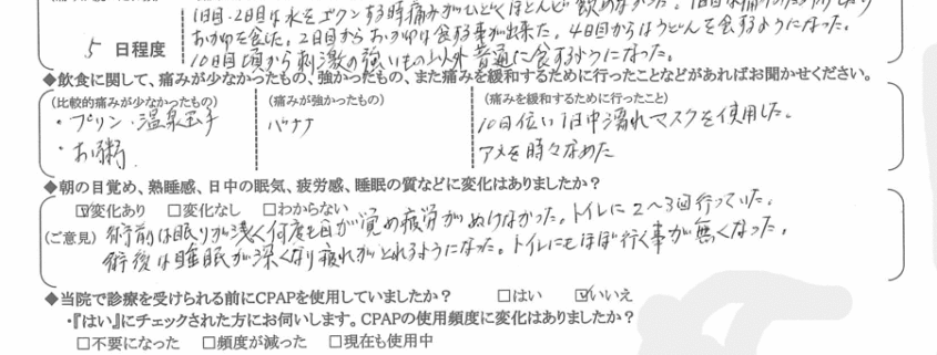(ご意見) 術前は眠りが浅く何度も目が覚め疲労が抜けなかった。トイレに2~3回行っていた。術後は睡眠が深くなり疲れが取れるようになった。トイレにもほぼ行く事が無くなった。