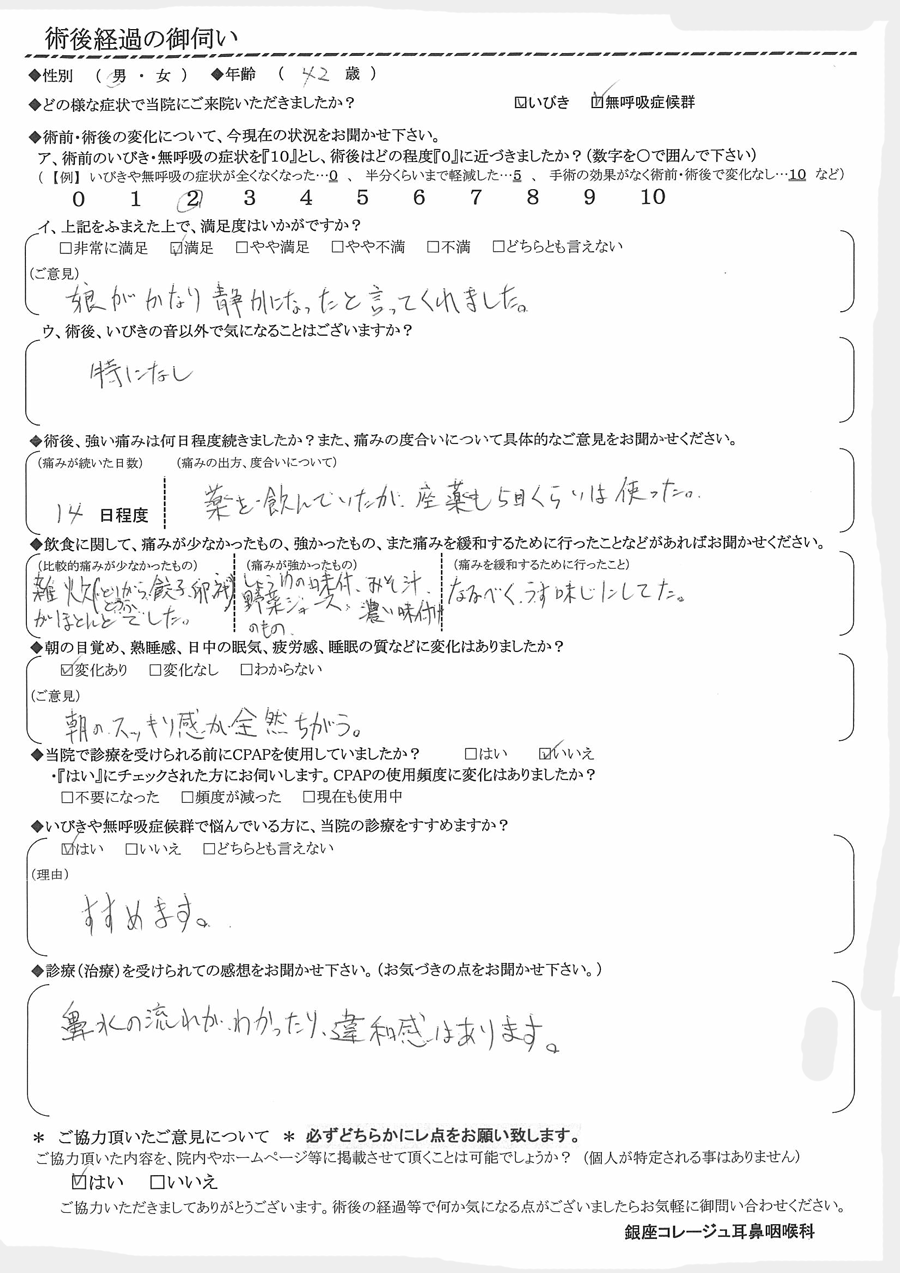 ア, 術前のいびき・無呼吸の症状を『10』だったとすると、術後はどの程度になりましたか? 【2】