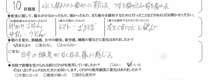 (痛みの程度について) 水を飲むのに飲みにくく苦労した。つばを飲み込む時も痛かった。