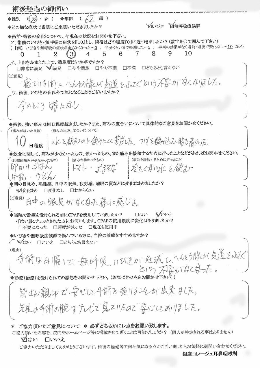 (ご意見) 寝ている間に扁桃腺が気道をふさぐという不安がなくなりました。