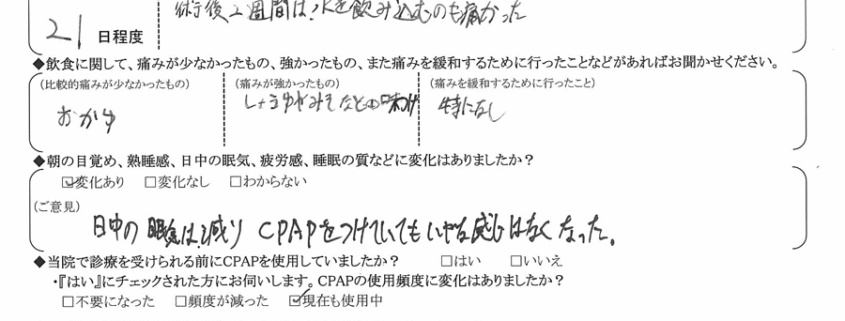 (ご意見) 日中の眠気は減りCPAPをつけていても嫌な感じはなくなった。