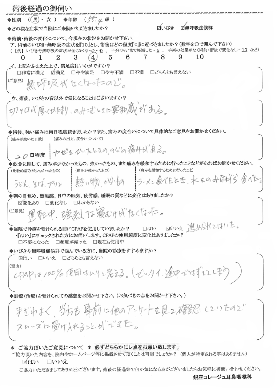 ア, 術前のいびき・無呼吸の症状を『10』だったとすると、術後はどの程度になりましたか? 【4】