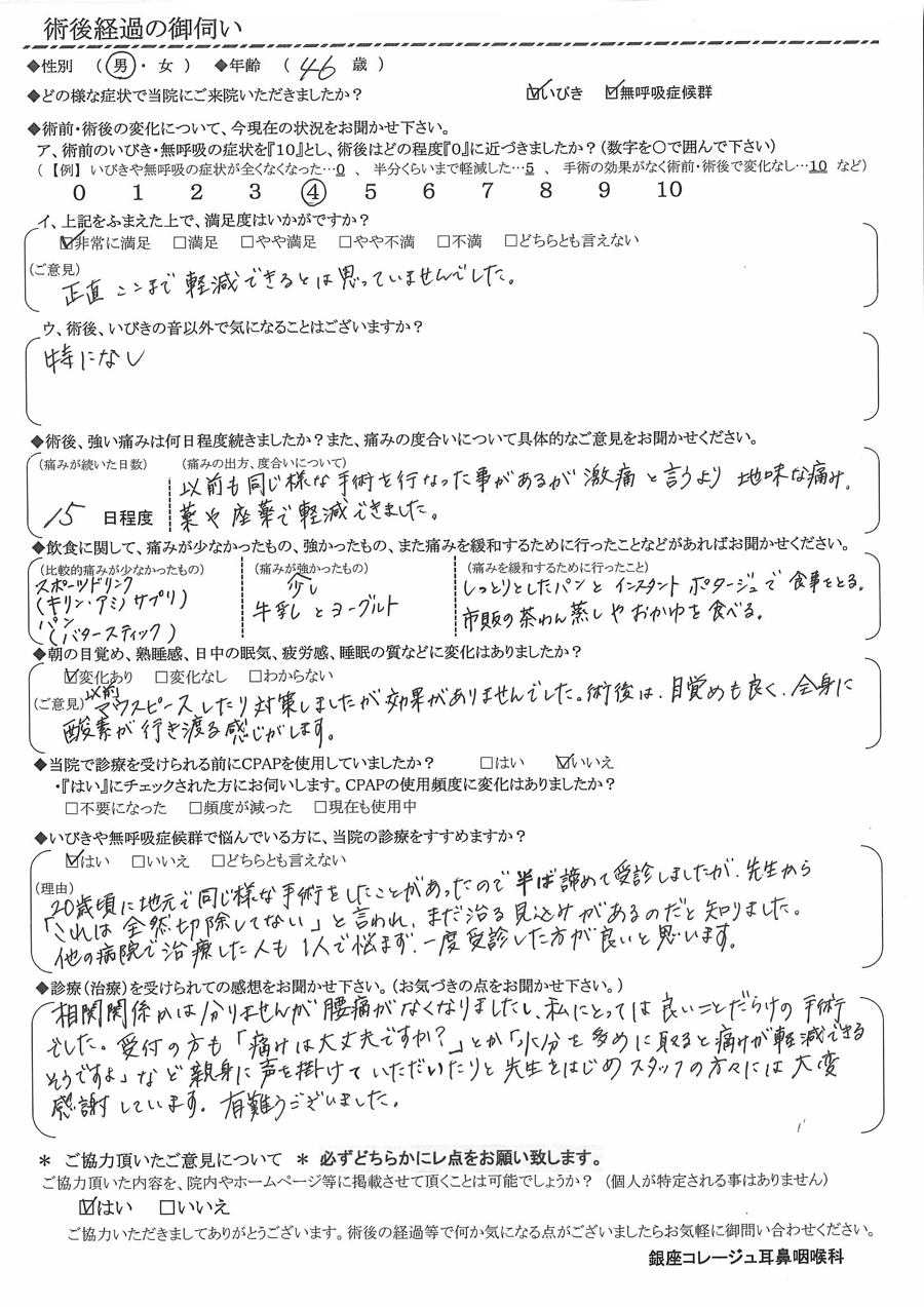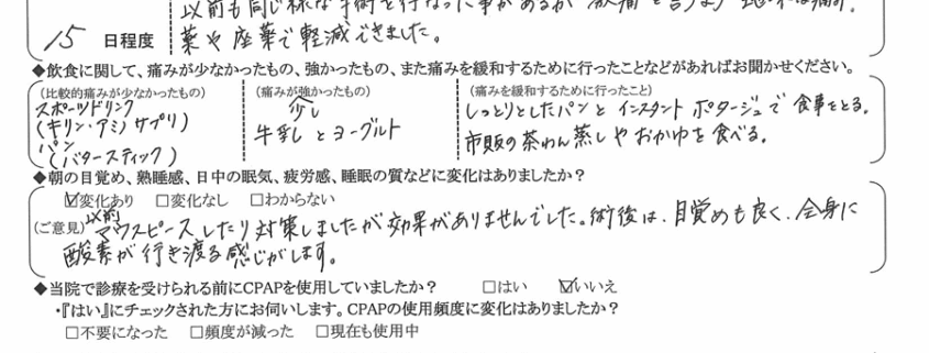 (ご意見) 以前マウスピースしたり対策しましたが効果がありませんでした。術後は、目覚めもよく、全身に酸素が行きわたる感じがします。