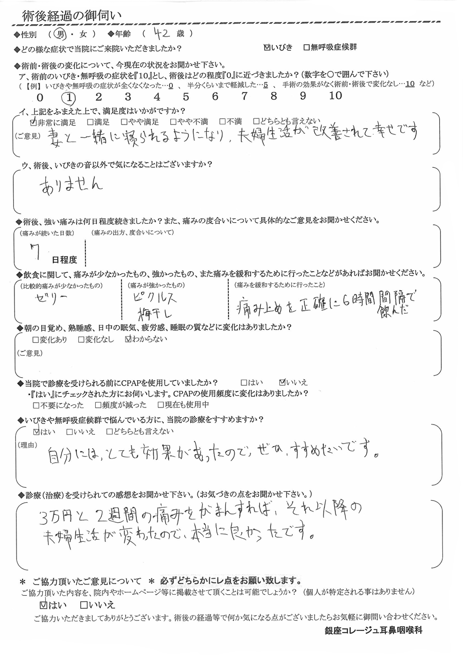 (ご意見)  妻と一緒に寝られるようになり、夫婦生活が改善されて幸せです。