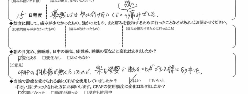 (ご意見) CPAPの拘束感が無くなったので、楽な姿勢で眠ることができる様になりました。