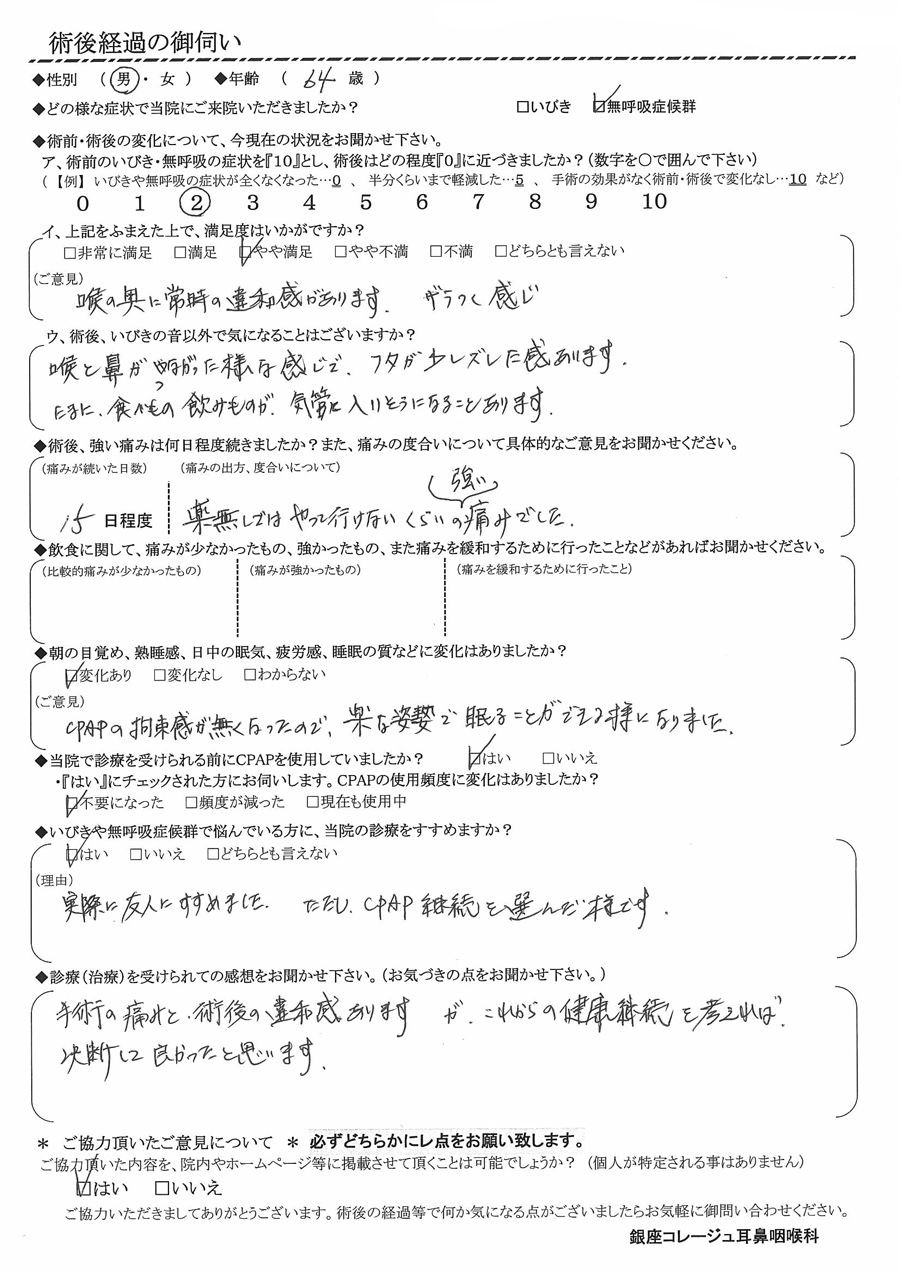 ア, 術前のいびき・無呼吸の症状を『10』だったとすると、術後はどの程度になりましたか? 【2】