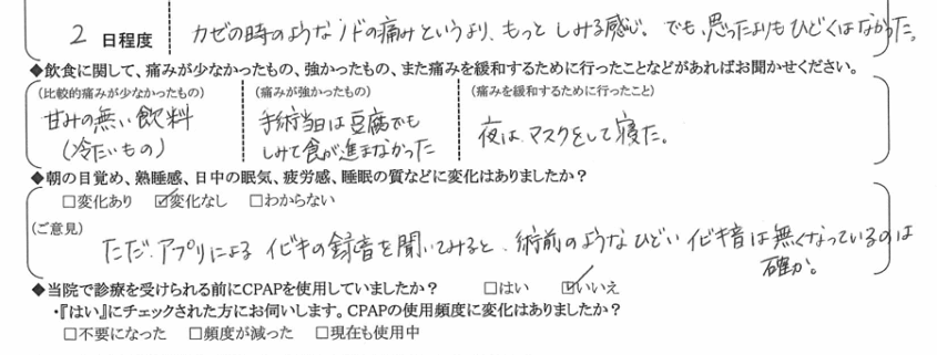 (ご意見)  ただアプリによるいびきの録音を聞いてみると、術前のようなひどいイビキ音は無くなっているのは確か。