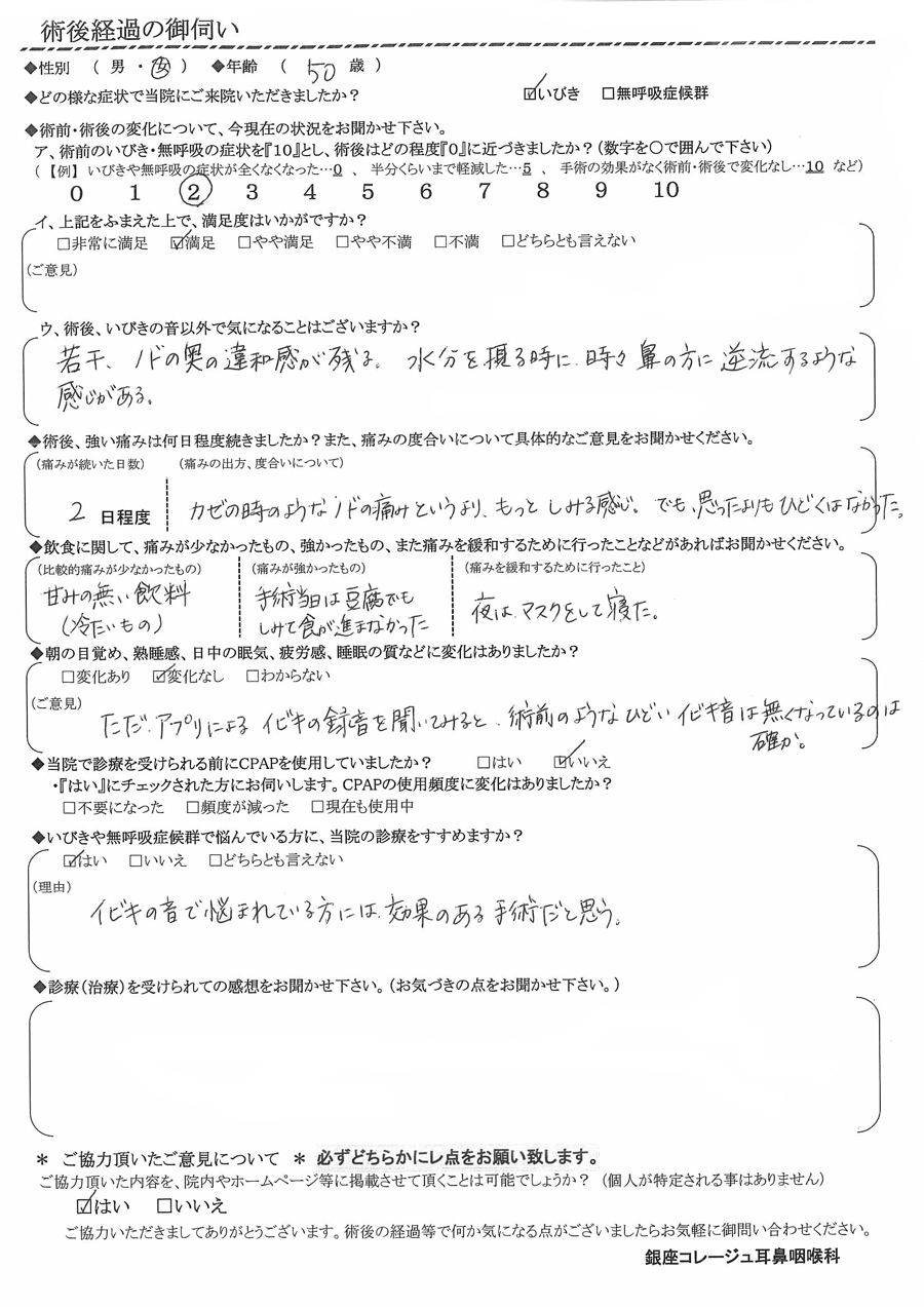 (理由)   イビキの音で悩まれている方には効果のある手術だと思う。