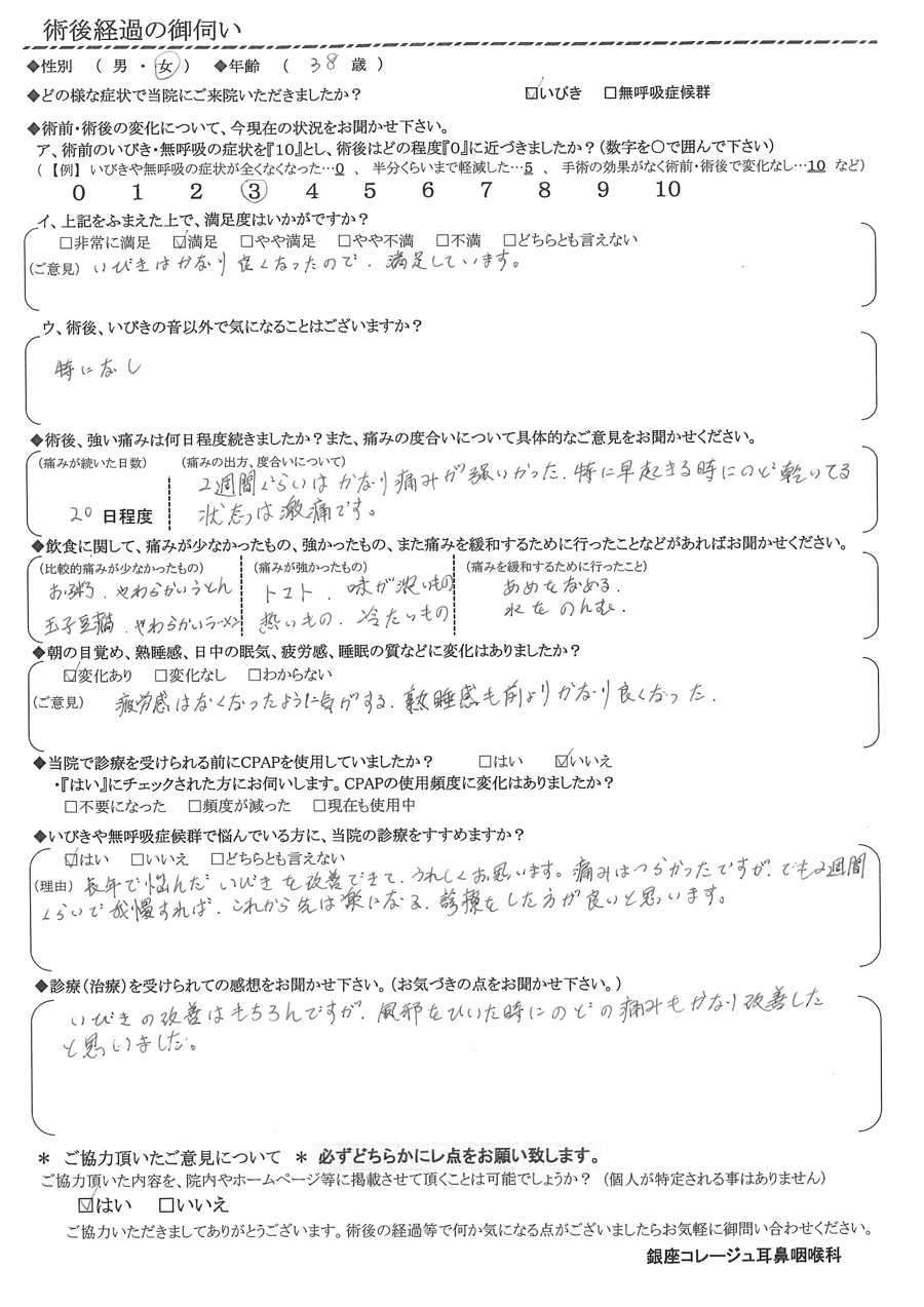 (理由) 長年悩んだいびきを改善できて、嬉しく思います。痛みは辛かったですが、でも2週間位で我慢すれば、これから先は楽になる。診療をした方が良いと思います。