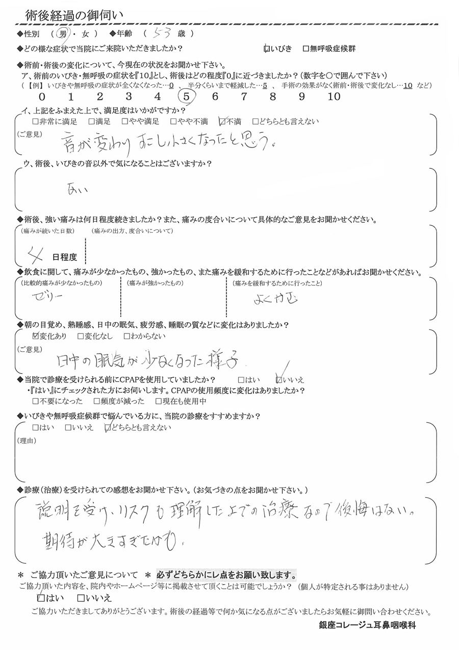 ア, 術前のいびき・無呼吸の症状を『10』だったとすると、術後はどの程度になりましたか? 【5】