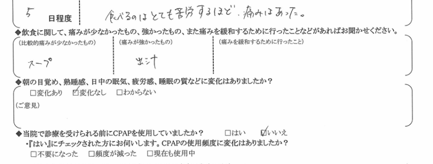 (痛みの程度について) 食べるのはとても苦労するほど、痛みはあった。