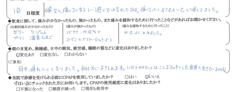 (ご意見)  日中疲れにくくなりました。朝もすぐ起きられます。いびきかかない人はこんなスッキリした世界に生きているとは!
