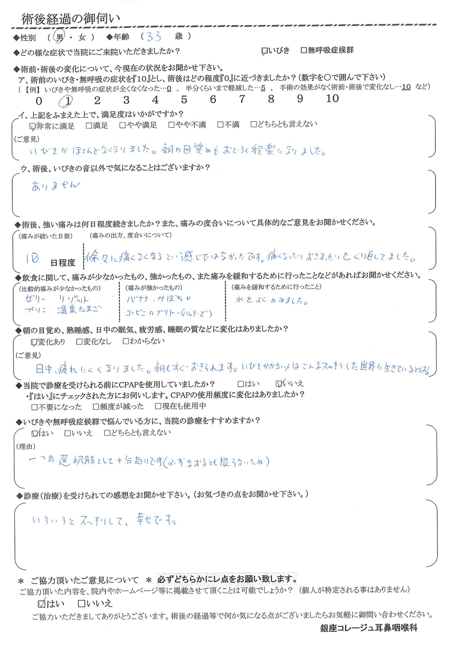 (ご意見)  いびきがほとんどなくなりました。朝の目覚めも驚く程楽になりました。