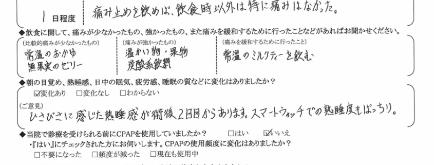 (ご意見) 久々に感じた熟睡感が術後2日目からあります。スマートウォッチでの熟睡度もバッチリ。