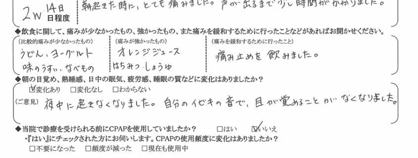 (ご意見)  夜中に起きなくなりました。自分のいびきの音で、目が覚めることがなくなりました。