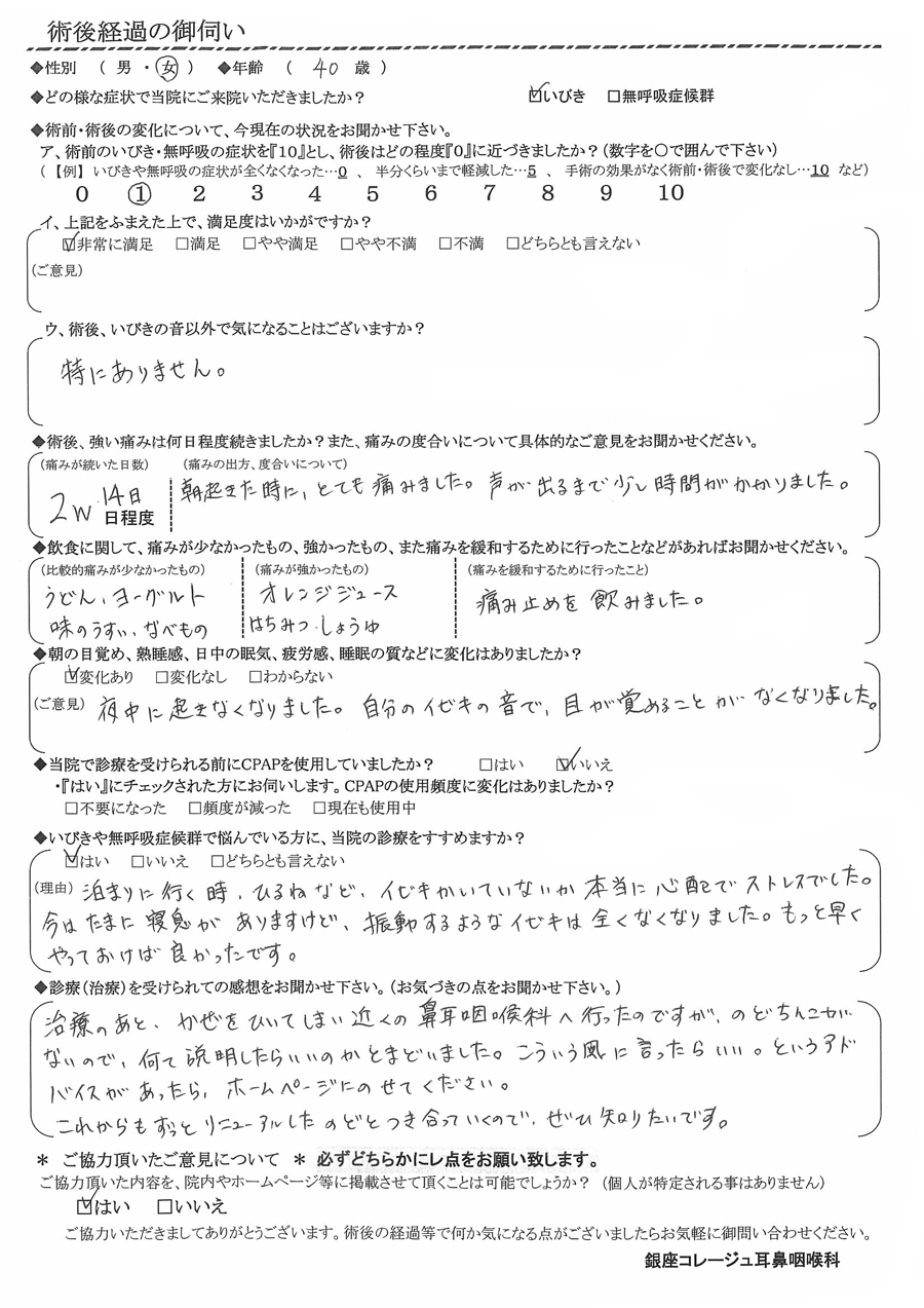 (理由)   泊まりに行く時、昼寝など、イビキかいていないか本当に心配でストレスでした。今はたまに寝息がありますけど、振動するようなイビキは全くなくなりました。もっと早くやっておけば良かったです。