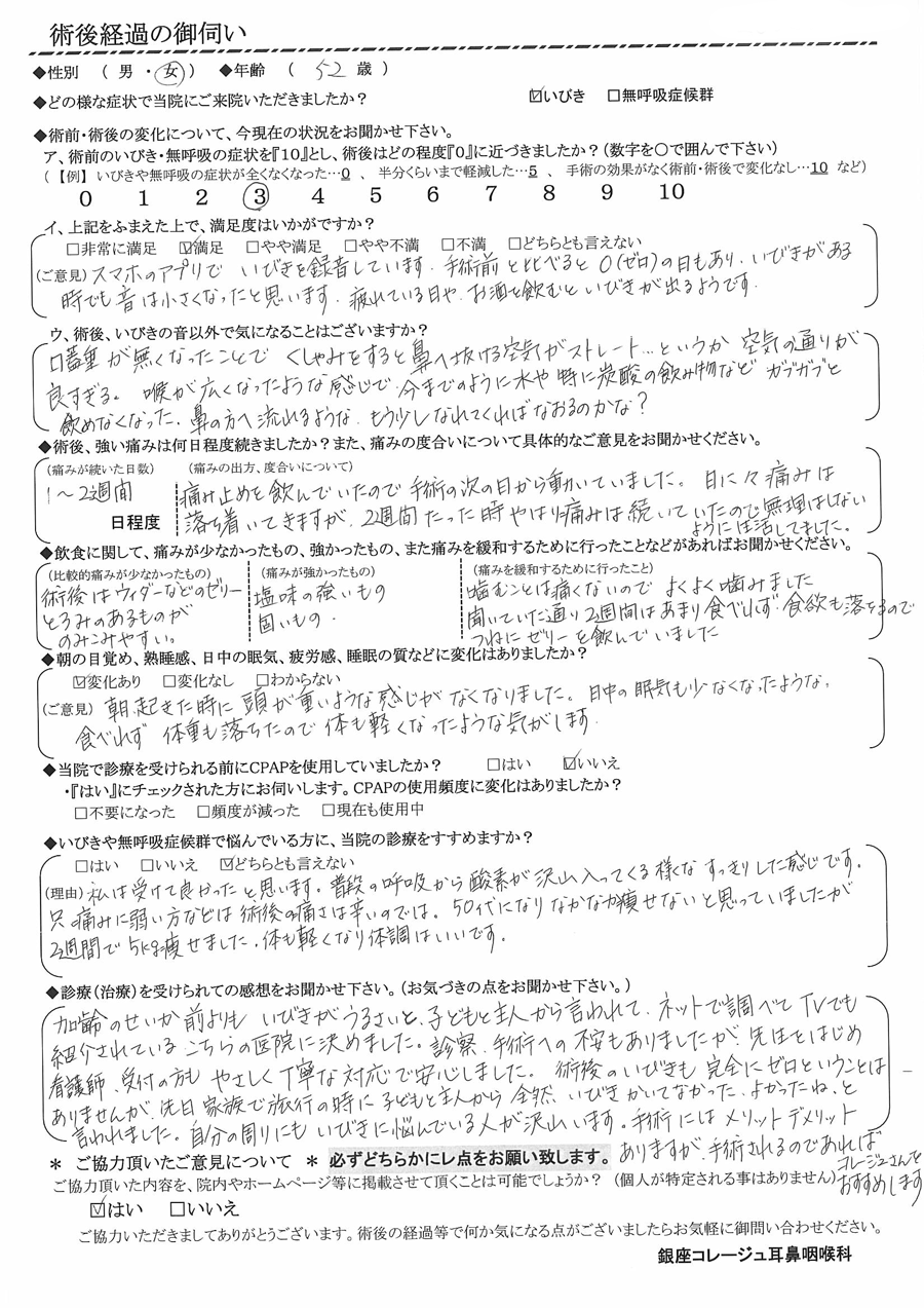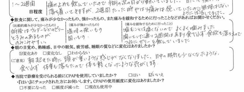 (ご意見) スマホのアプリでいびきを録音しています。手術前と比べると0の日もあり、いびきがある時でも音は小さくなったと思います。疲れている日や、お酒を飲むといびきが出るようです。