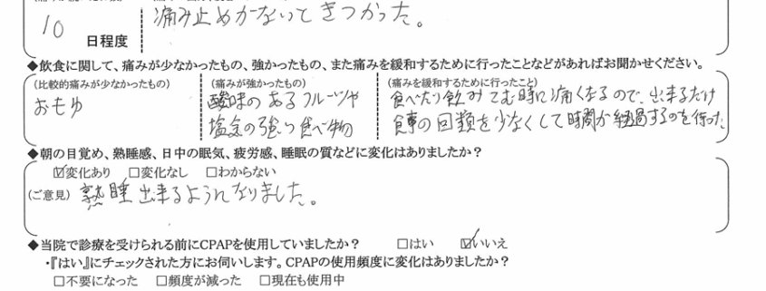 A:(痛みを緩和するために行ったこと)  食べたり飲み込む時に痛くなるので、出来るだけ食事の回数を少なくして時間が経過するのを待った