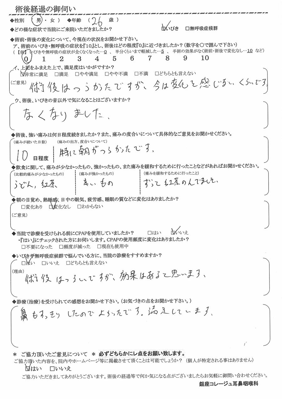 ア, 術前のいびき・無呼吸の症状を『10』だったとすると、術後はどの程度になりましたか? 【0】