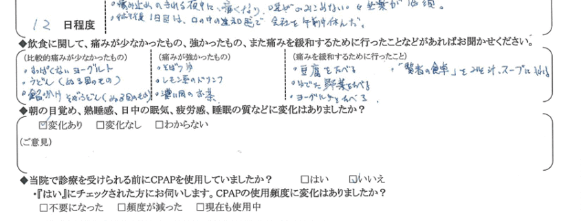 A:(痛みが少なかったもの) 酸っぱくないヨーグルト、うどん(ぬるめのもの)、あんかけそば・うどん(ぬるめのもの)