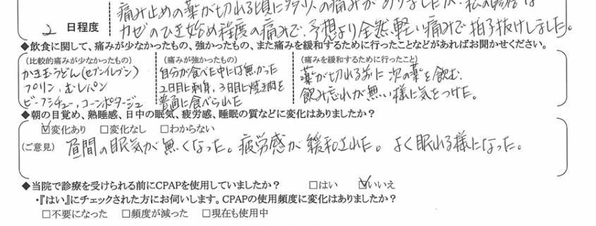 (ご意見)  昼間の眠気が無くなった。疲労感が緩和された。よく眠れる様になった。