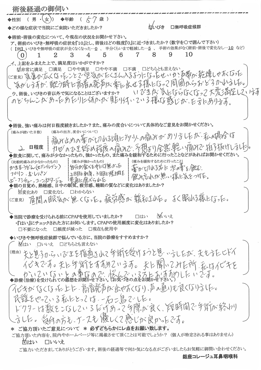 (ご意見)  気道が広くなった事で空気がたくさん入るようになったせいか、声帯が乾燥しやすくなった気がしますが、歌うときに高音が楽に出せるようになって周囲から驚かれました。いびきが気にならなくなって大変満足しています。