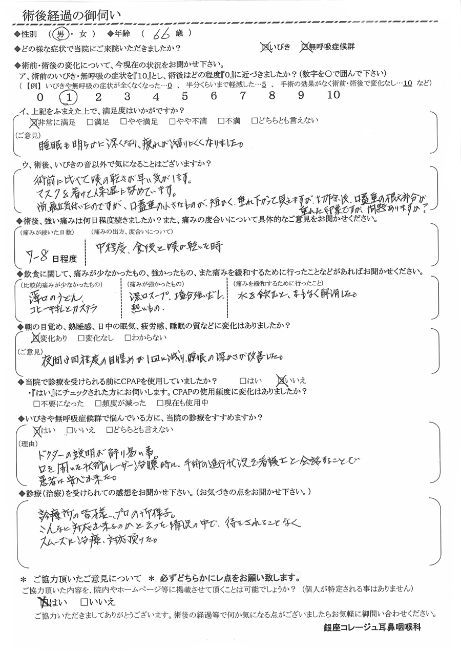 ア, 術前のいびき・無呼吸の症状を『10』だったとすると、術後はどの程度になりましたか? 【1】