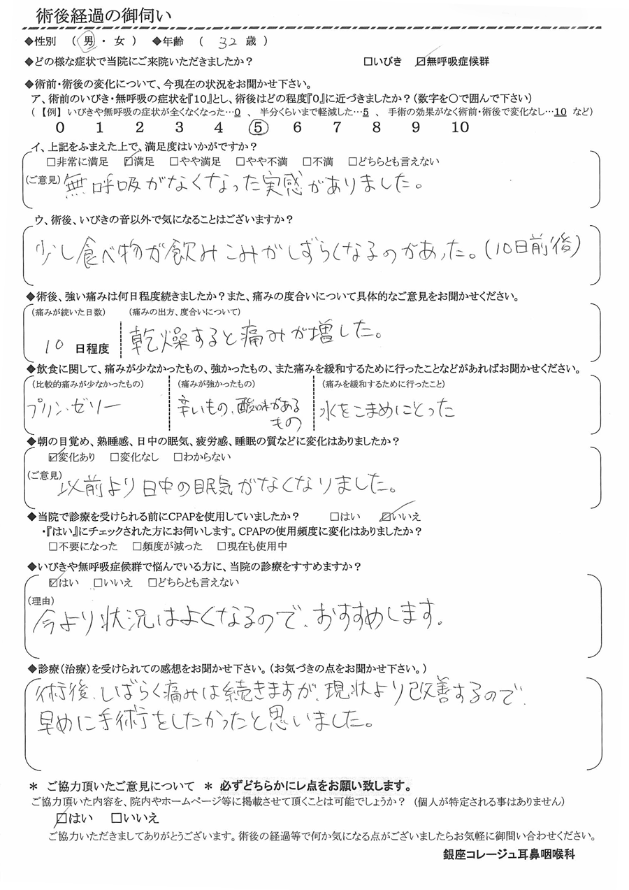 ア, 術前のいびき・無呼吸の症状を『10』だったとすると、術後はどの程度になりましたか? 【5】