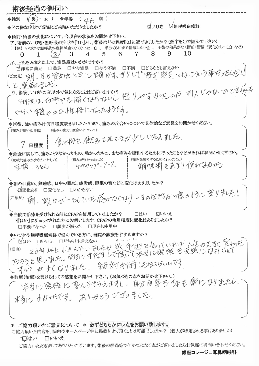 術後は仕事中も眠くならないし、怒りやすかったのが別人じゃないのと言われるぐらい穏やかな性格になったようです。
