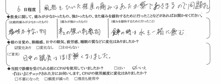 (ご意見) 日中の眠気はほぼ無くなりました。