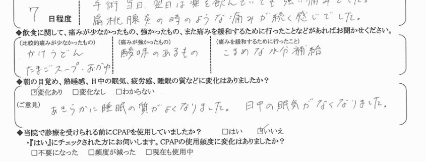 (理由) 手術後の痛みはありますが、それをふまえても睡眠の質が向上したので、おすすめします。