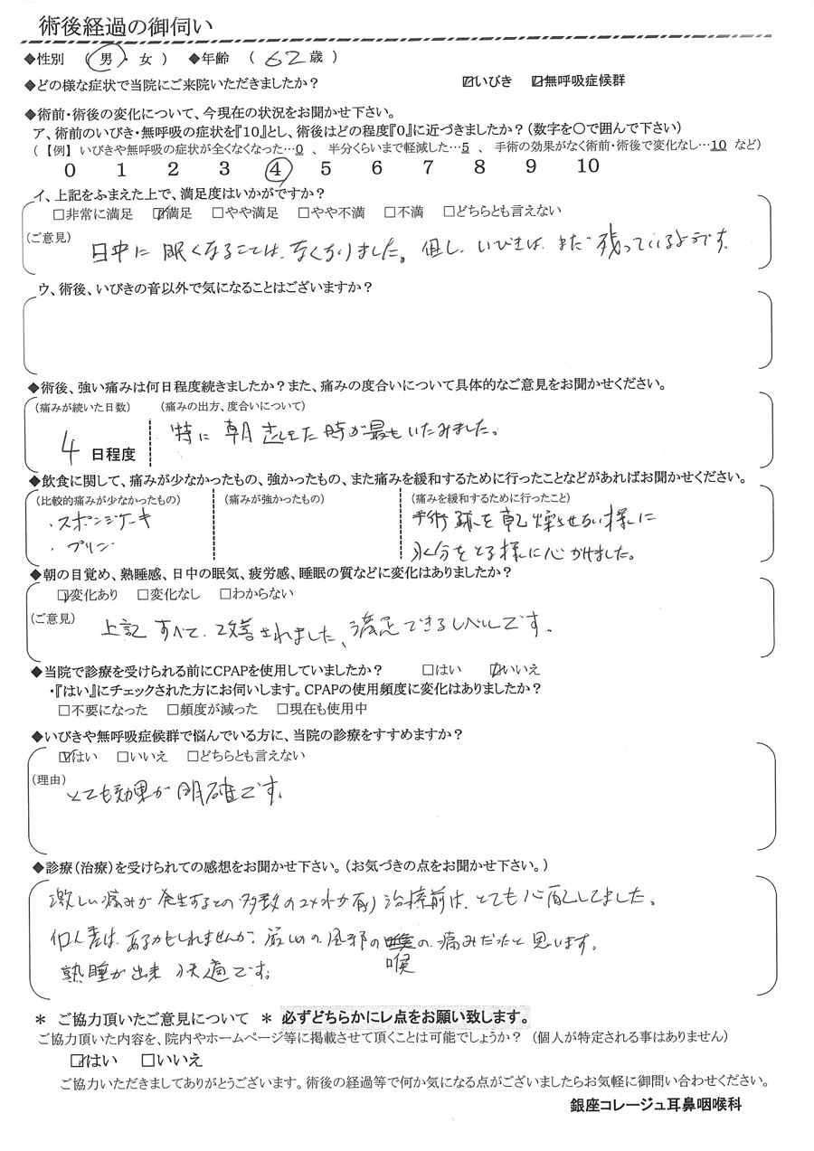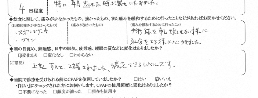 (ご意見) 日中に眠ることは無くなりました。但し、いびきはまだ残っているようです。