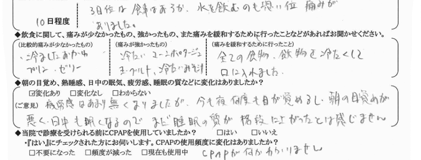 (ご意見) 疲労感はあまり無くなりましたが、今も夜何度も目が覚めるし朝の目覚めが悪く、日中も眠たくなるので睡眠の質が格段に上がったことは感じません。