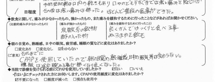(ご意見) それまでにCPAPを使用していたので、朝の目覚め・熟睡感・日中の眠気等は変わらない。