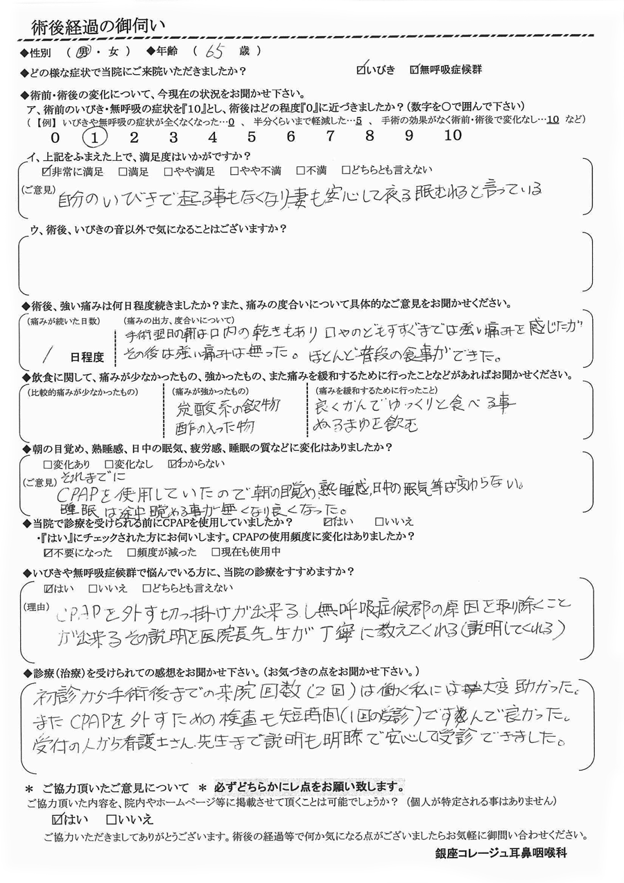 A: 初診から手術後までの来院回数(2回)は働く私には大変助かった。また、CPAPを外すための検査も短時間(1回の受診)で済んで良かった。受付の人から看護師さん、先生まで説明も明瞭で安心して受診できました。