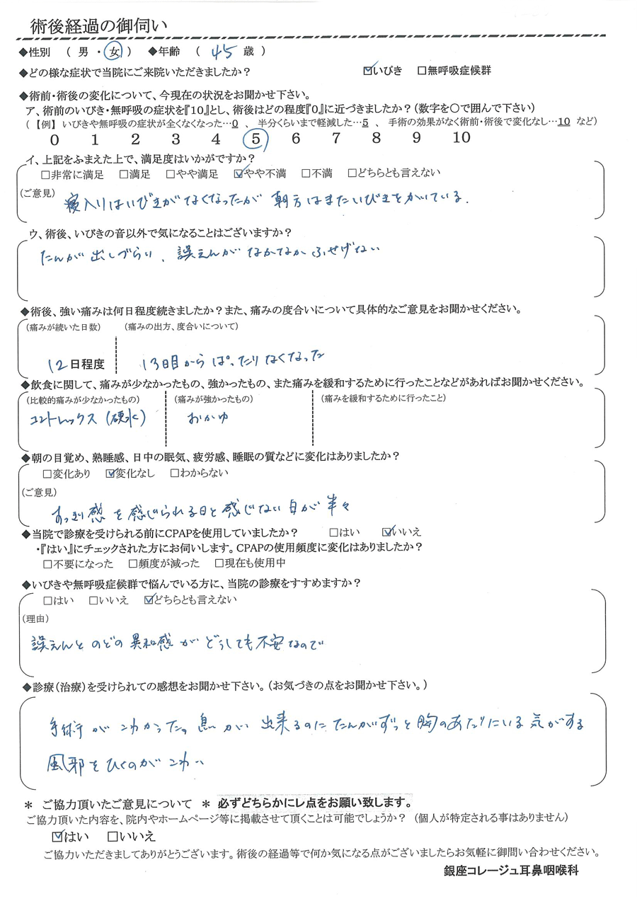 (ご意見)  寝入りはいびきが無くなったが、朝方は又いびきをかいている。