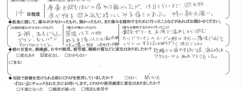 (痛みの程度について) 座薬を飲むほどの痛みは無かったが、14日くらいまでのみもの・食べ物を飲み込む時にしみる痛さがあった。特に朝は強い。