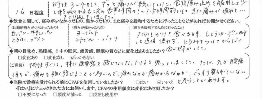 (痛みの程度について)  術後3~4日はずっと痛みが続いていた。食後痛み止めを服用して少し軽減されるも、次の食事時間の1~5っ時間前にはまた痛みが現れて…を繰り返していました。