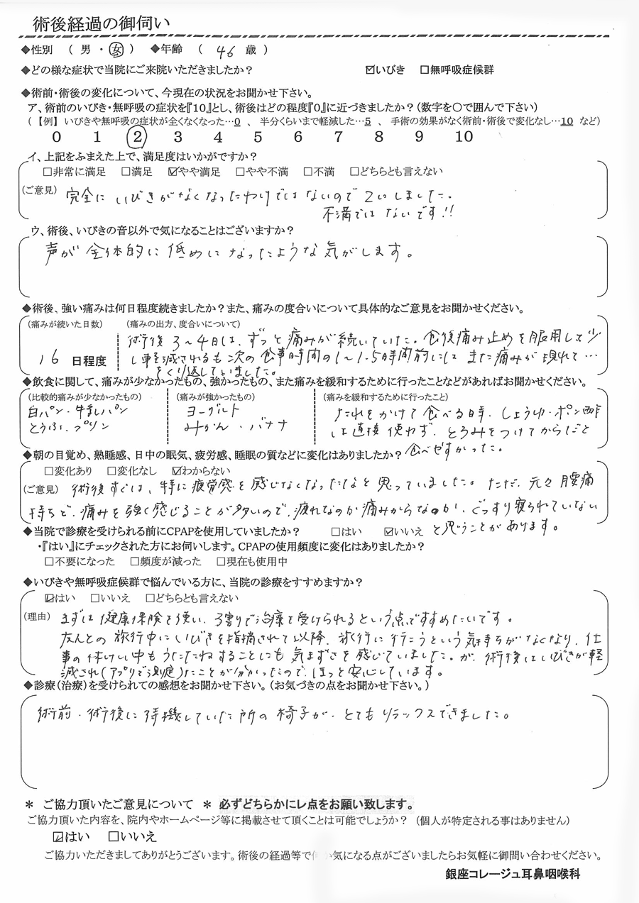 (理由)  まずは健康保険を使い、3割で治療を受けられるという点ですすめたいです。友人との旅行中にいびきを指摘されて以降、旅行に行こうという気持ちがなくなり、仕事の休憩中もうたたねする事にも気まずさを感じていました。が、術後はいびきが軽減され(アプリで測定)たことが分かったので、ほっと安心しています。